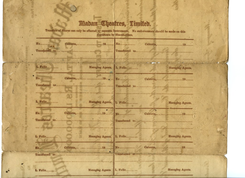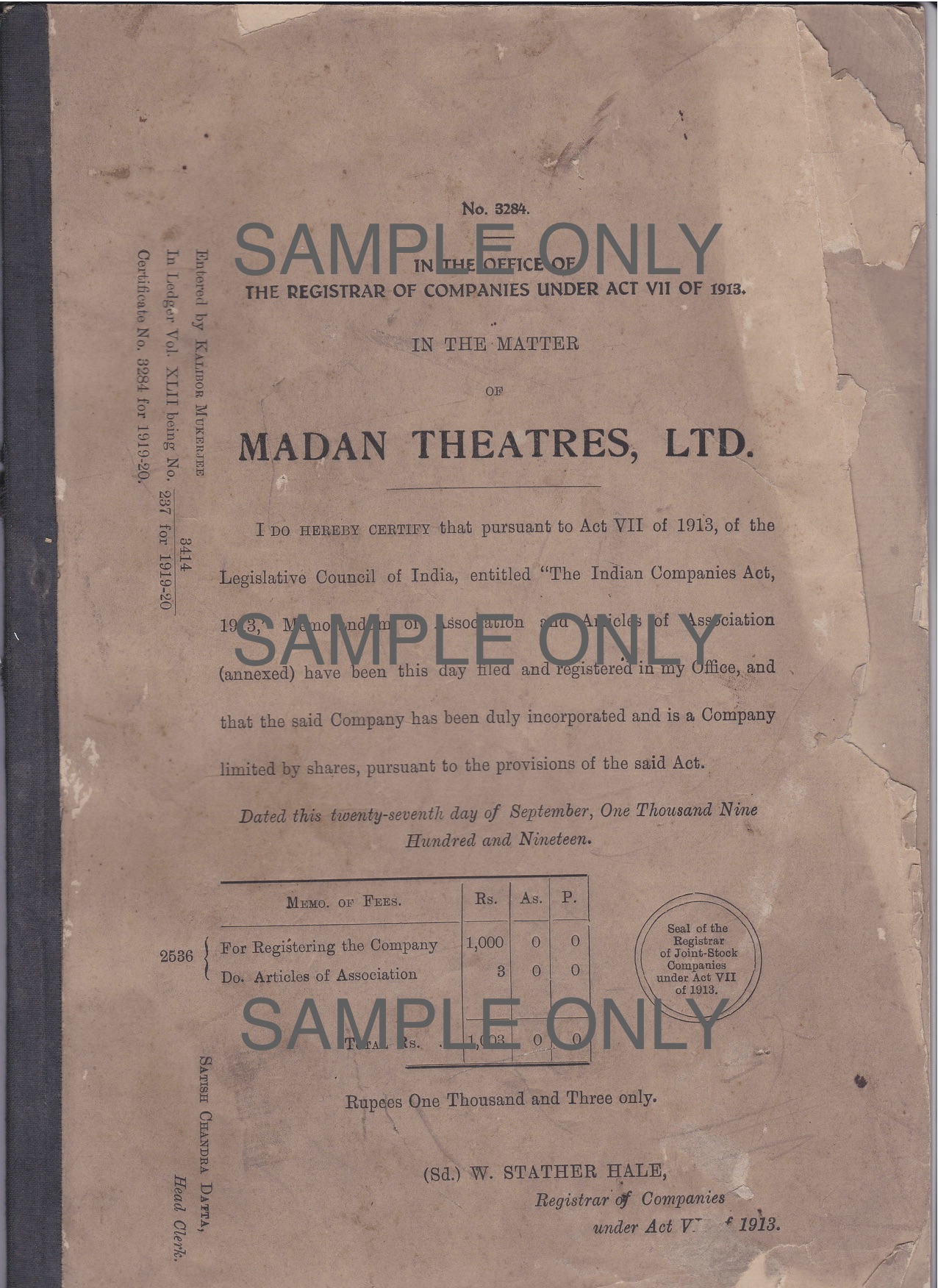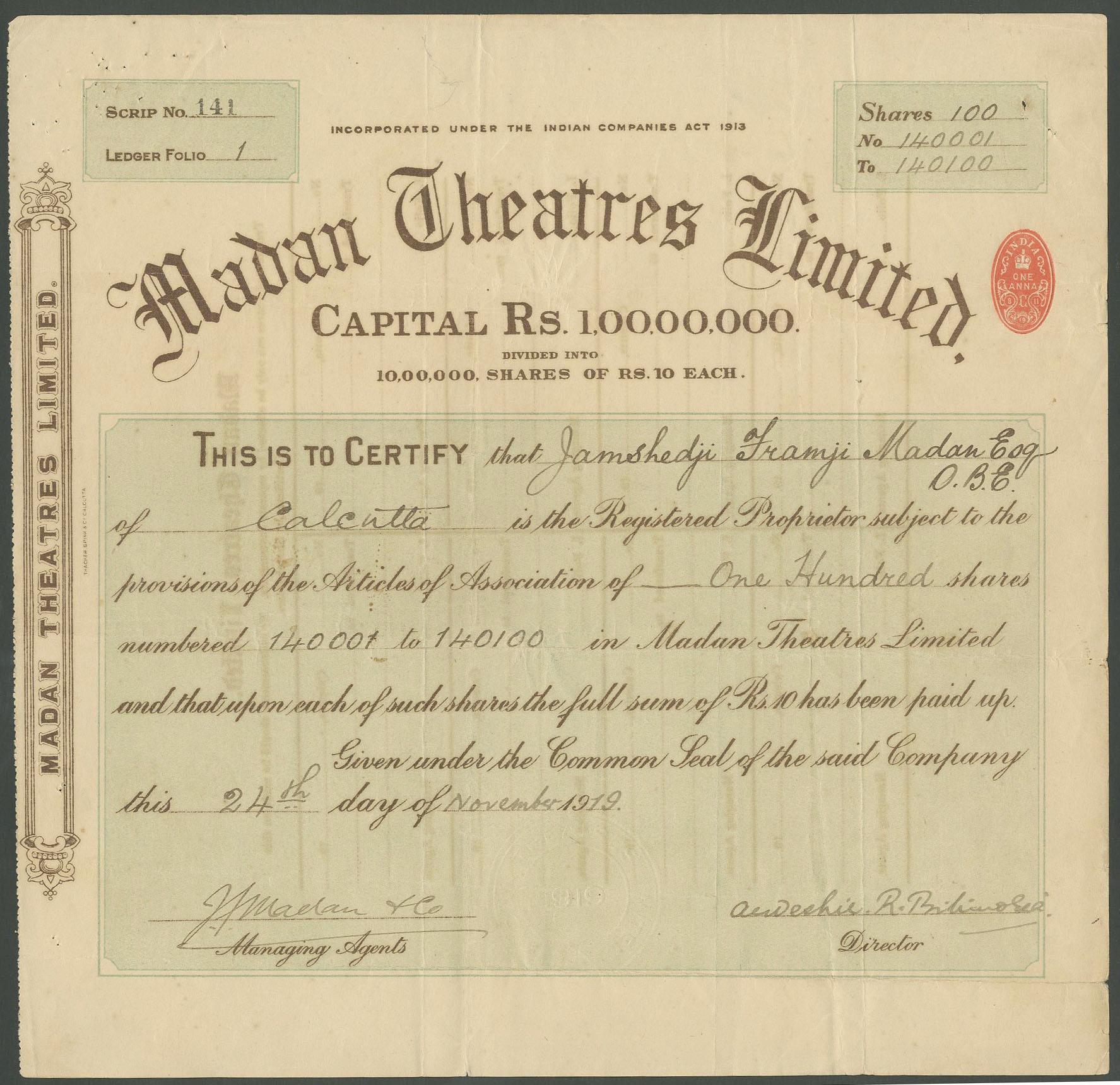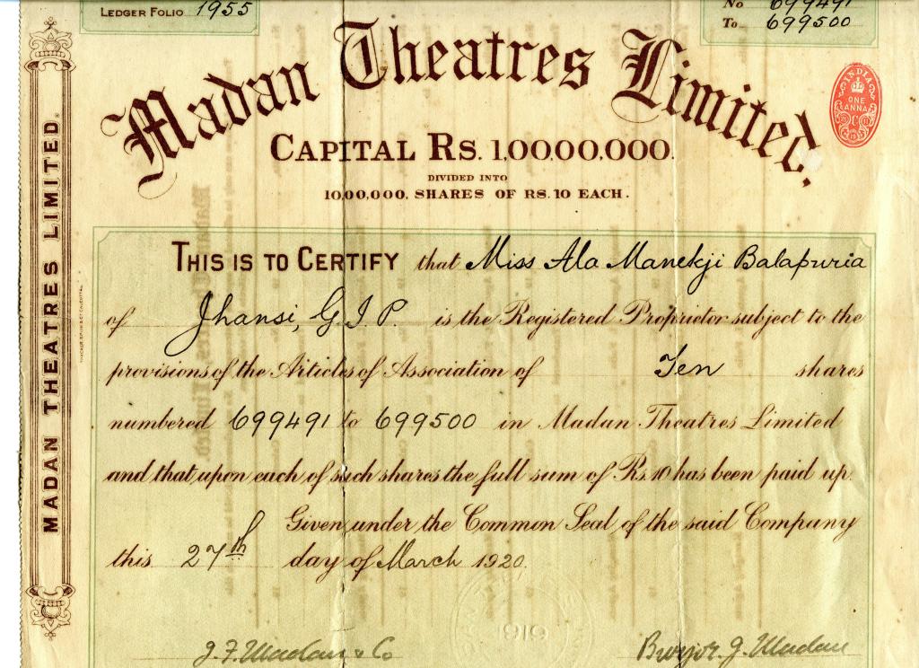 Image: 1920 share certificate for Madan Theatres Ltd. Issued on 27th March 1920 to Ala Manekji Balapuria. Ala later married Naval Jamshedji Madan, son of J F Madan. The image is taken from the original held in the private collection of Ashley Coates, great-grandson of Ala and Naval. It was scanned in 2007. Note: imprint of 1919 company stamp. Image: Courtesy: Ashley Coates – private collection.J F Madan Co letter headed paper “wine and general merchant”. Image courtesy: Gool Madan Ardeshir – private collectionMadan Theatres letter headed paper “controlling a circuit of 100 cinemas”. Image courtesy: Gool Madan Ardeshir – private collection.Madan Theatres – Registrar of Companies. Image Courtesy: Gool Madan Ardeshir. All Rights ReservedList of original directors for Madan Theatres Ltd from 1919 Memorandum of Understanding. Image Courtesy: Gool Madan Ardeshir. All Rights Reserved.Accompanying note to 1920 Madan Theatres Ltd. share certificate, shown above. 2007 scan of original. Image courtesy: Ashley Coates – private collection.Reverse side of 1920 share certificate, shown above. 2007 scan of original. Image courtesy: Ashley Coates – private collection.Exhibiting circuit, around late 1920s, early 1930s. Provenance unknown.J F Madan’s 1919 certificate. Scan origin unknown.