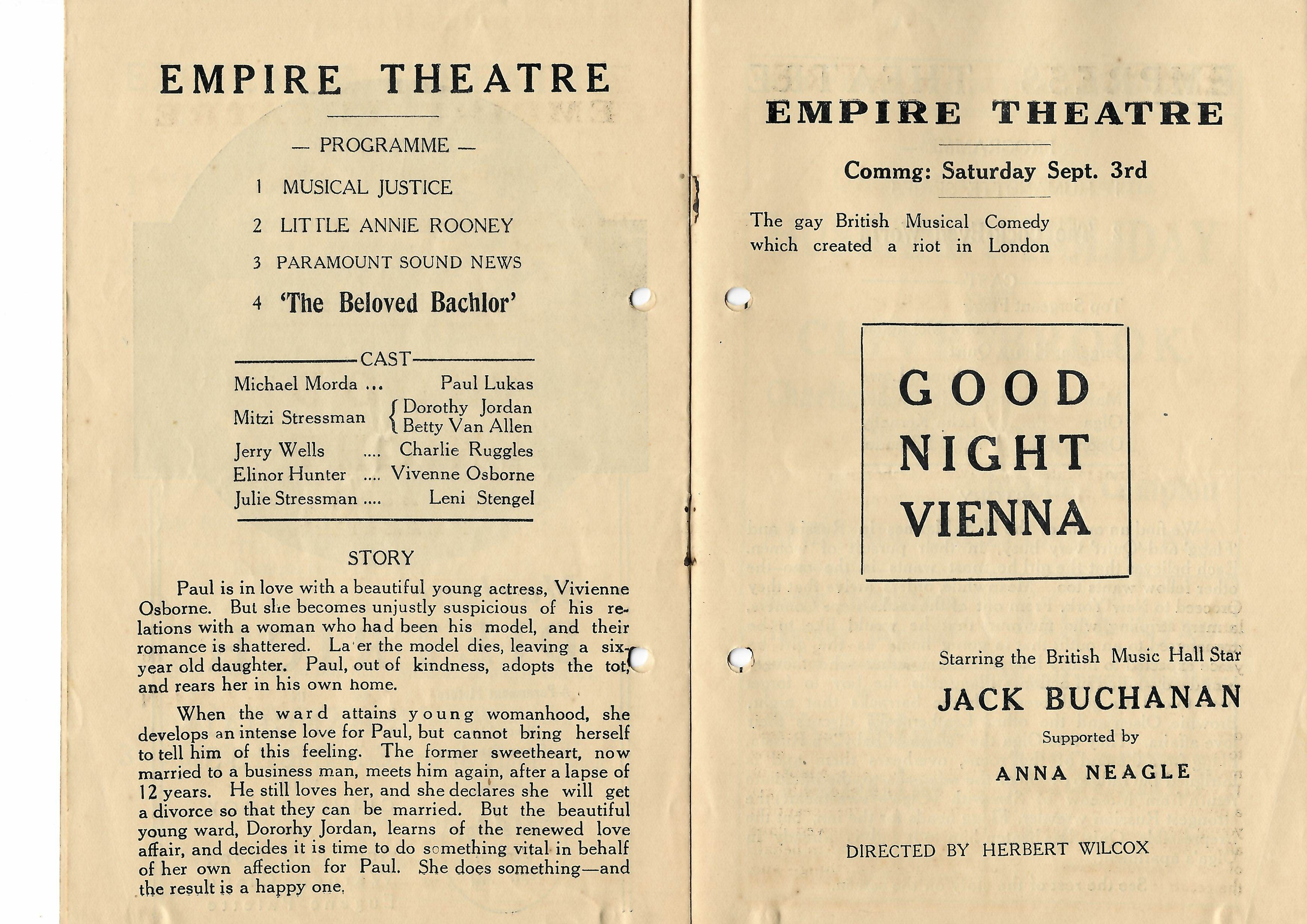 Programme showing upcoming events at the four sites operated by the firm in Bombay in 1932: Excelsior, Empire, Empress and the Royal Opera House.
